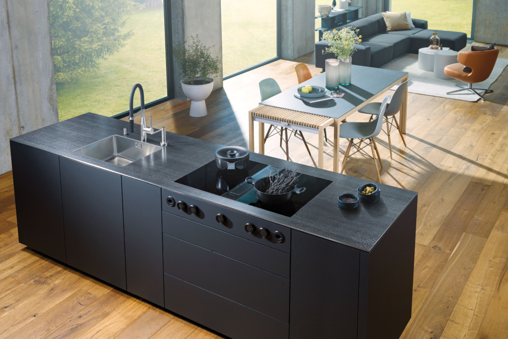 Der Auszug lässt sich wiederum mit einer Verbundplatte abdecken. Das Deckblatt für den Auszug ist unter dem Tisch zwischengelagert. Die grosse Variante des Tisches misst 192-270 cm mit einem Auszug und mit zwei 192-348 cm. Der Tisch lässt sich stufenlos vergrössern. Es entsteht stufenweise ein schmaler Platz welcher auch ohne Deckblatt zum Beispiel als Anrichte oder Ablage verwendet werden kann. Bei mehr Fläche ergeben sich zwei weitere Essplätze. Bei der grossen Version entsteht eine Festtafel für bis zu 10-12 Personen.