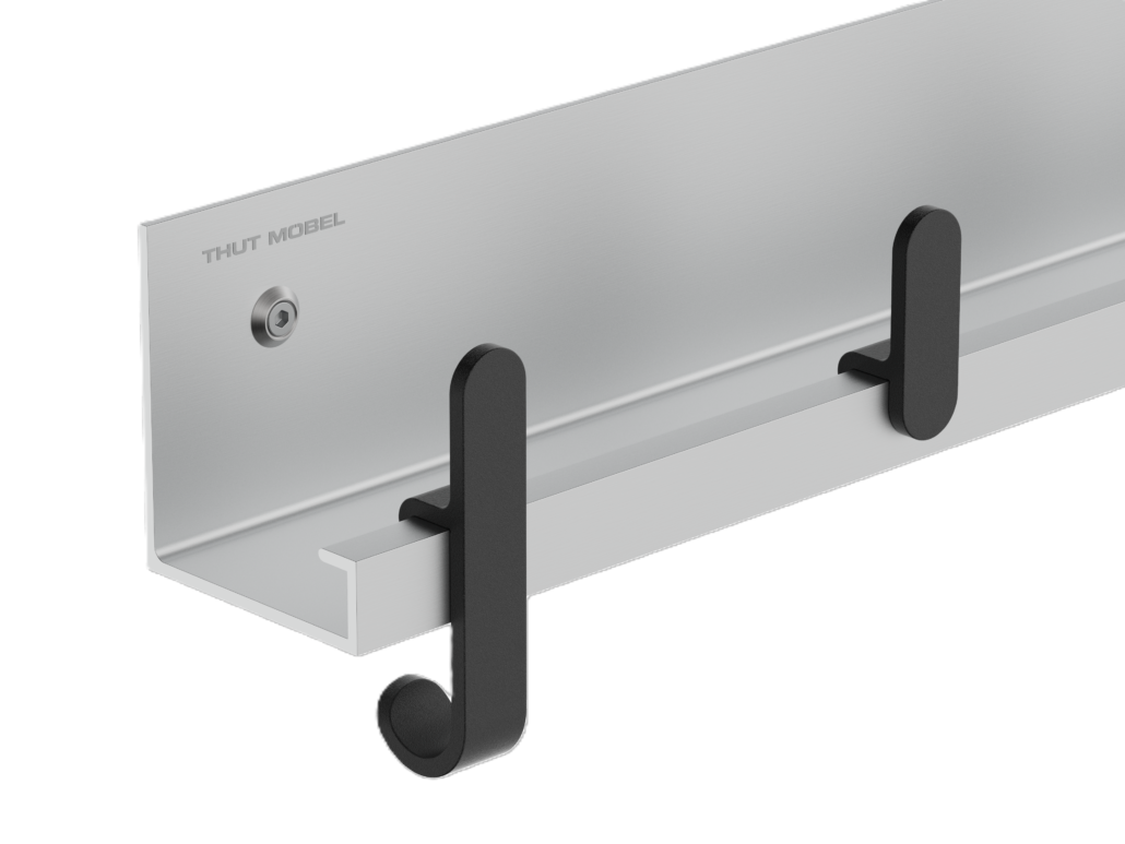 Garderobe 125 von Thut Möbel – das Aluminiumprofil zur Wandmontage setzt in jedem Raum Akzente. Flexible Kleiderhaken, einfach eingeklickt, ermöglichen eine rasche Anpassung. Die Ablage dient u. a. als Kartenständer oder Schlüsseldepot.