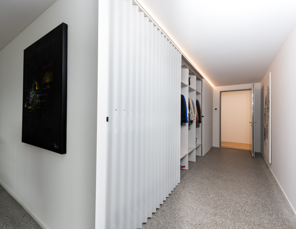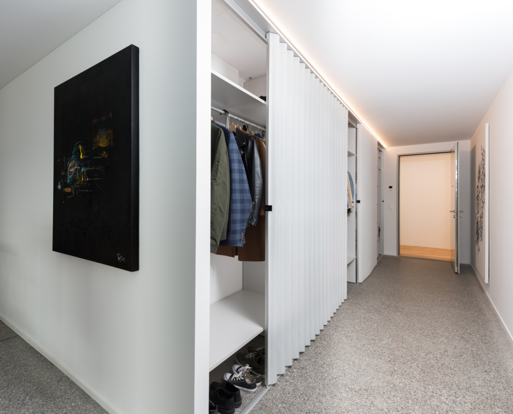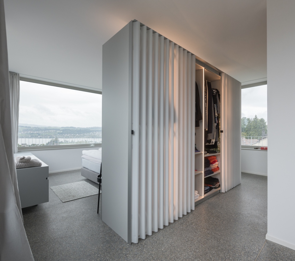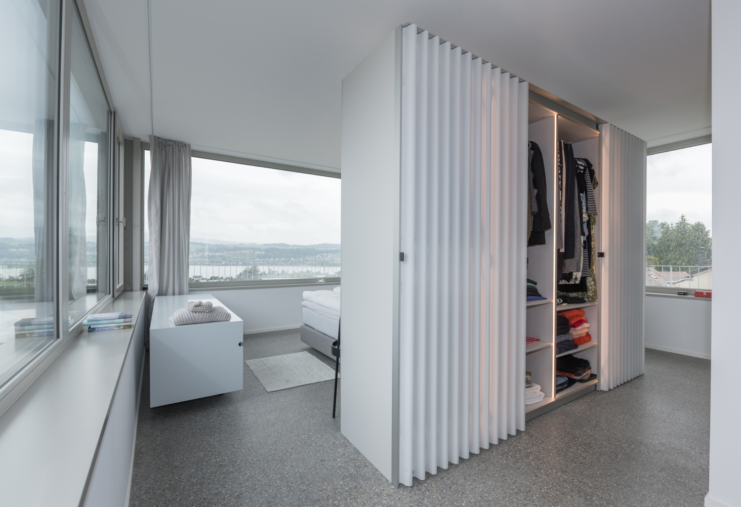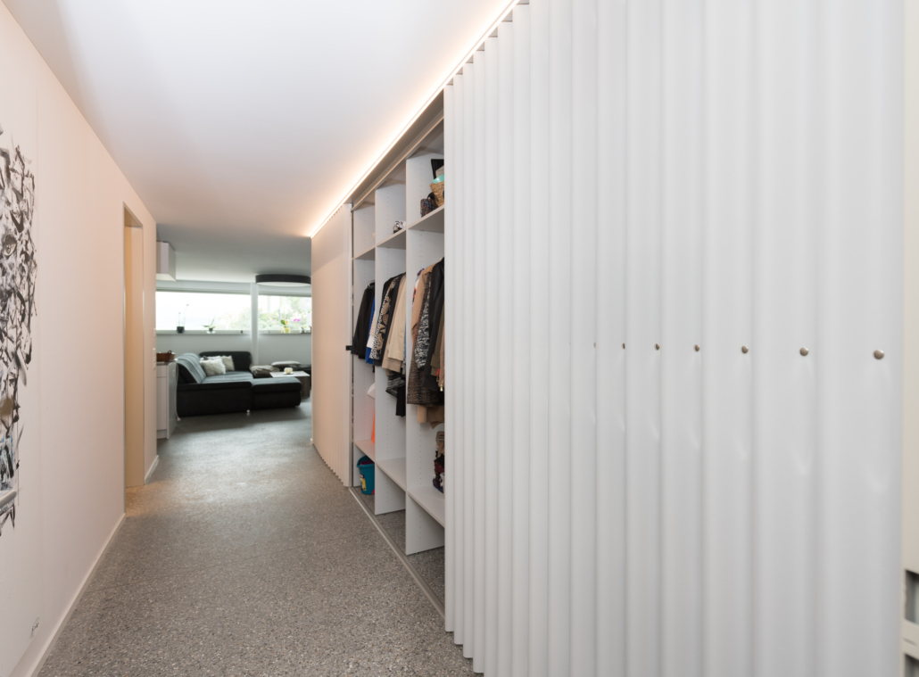 Ein älteres Ehepaar hat sich so sehr in die flexible Textilfront von Thut Möbel verliebt, dass sie diese gleich an mehreren Stellen in ihre Eigentumswohnung integriert hat. Ob als Schrank, der als Raumteiler zwischen Schlaf- und Ankleidebereich fungiert und durch den Einsatz von Filz ein angenehmeres akustisches Raumgefühl schafft, als Stauraum im Eingangsbereich oder zur Abschirmung von Elektrogeräten im Badezimmer – die Möglichkeiten sind vielfältig und bereicherten ihr Zuhause.