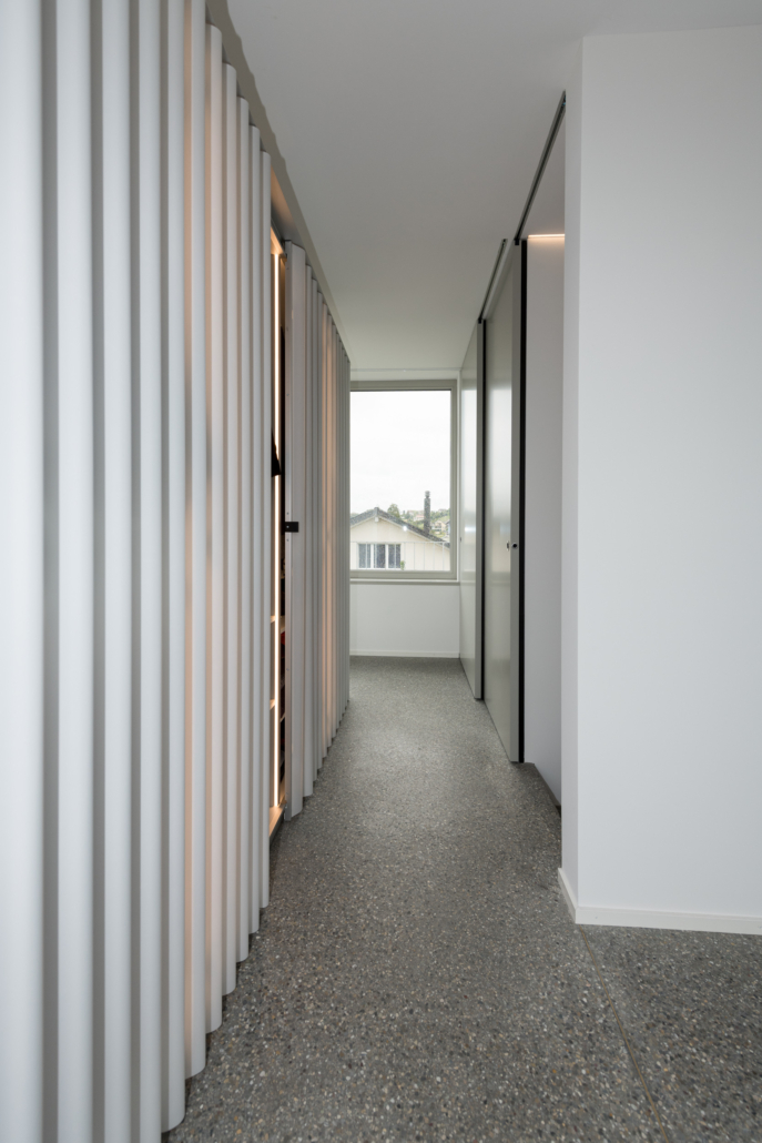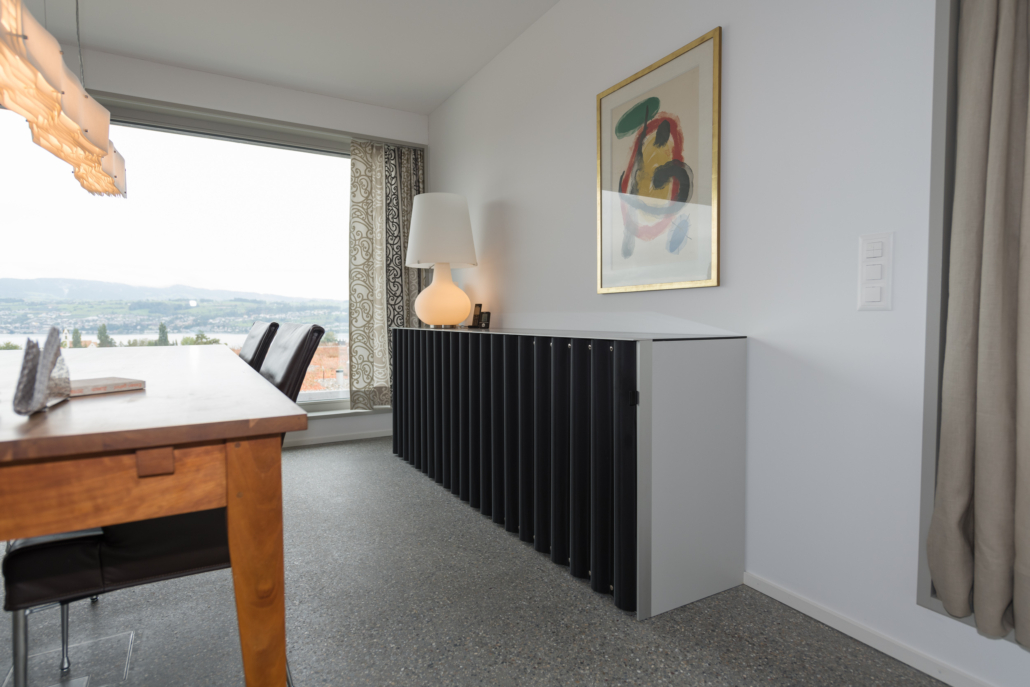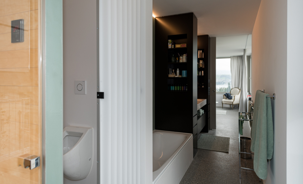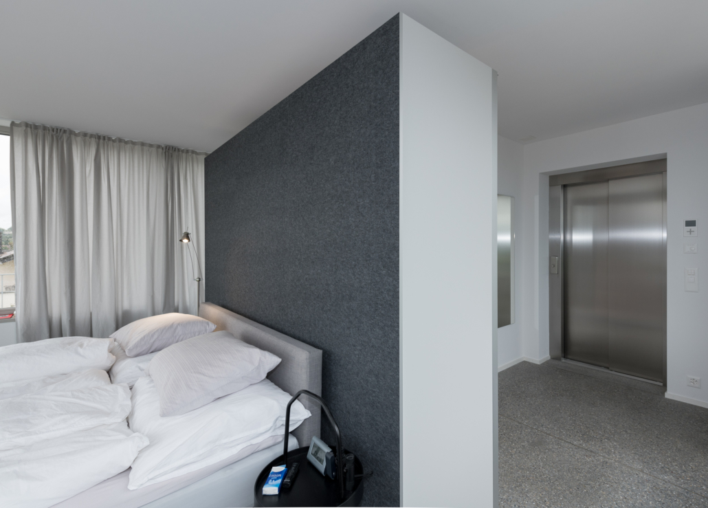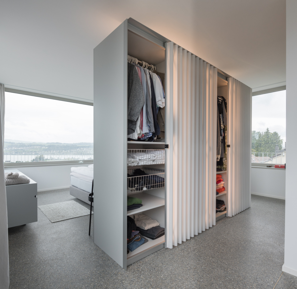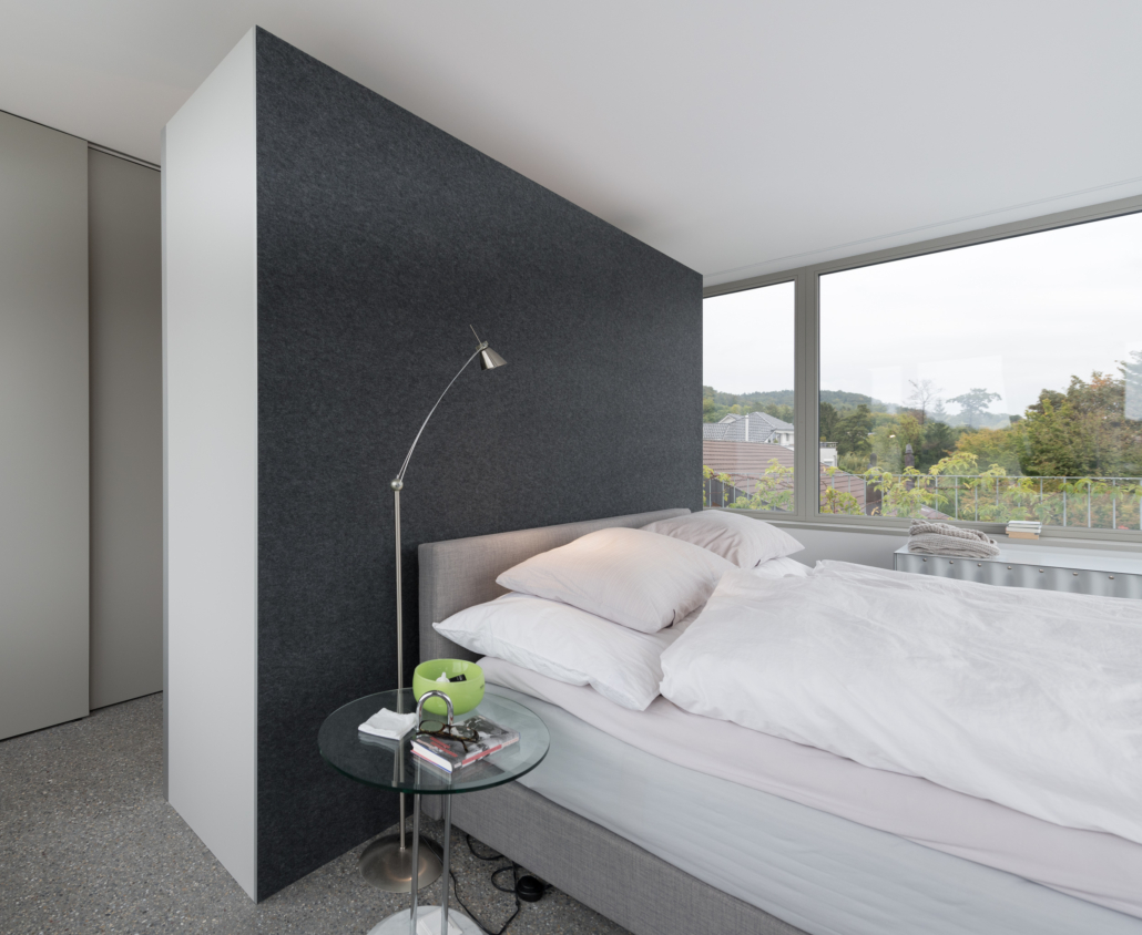 Ein älteres Ehepaar hat sich so sehr in die flexible Textilfront von Thut Möbel verliebt, dass sie diese gleich an mehreren Stellen in ihre Eigentumswohnung integriert hat. Ob als Schrank, der als Raumteiler zwischen Schlaf- und Ankleidebereich fungiert und durch den Einsatz von Filz ein angenehmeres akustisches Raumgefühl schafft, als Stauraum im Eingangsbereich oder zur Abschirmung von Elektrogeräten im Badezimmer – die Möglichkeiten sind vielfältig und bereicherten ihr Zuhause.